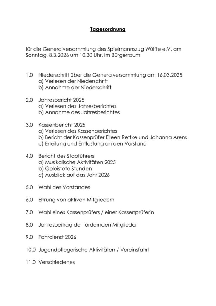 Einladung zur Generalversammlung des Spielmannszug Wülfte 1975 e.V.